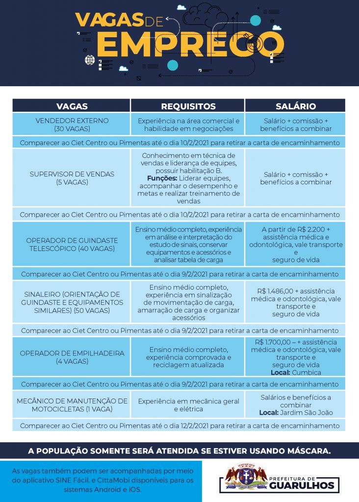 Os interessados, desde que cumpram os requisitos, devem comparecer às unidades Centro (avenida Monteiro Lobato, 734, Macedo) ou Pimentas (estrada do Capão Bonito, 65, Conjunto Marco Freire) do Ciet até as datas informadas abaixo, munidos de RG, CPF e carteira de trabalho, para que possam retirar as cartas de encaminhamento.