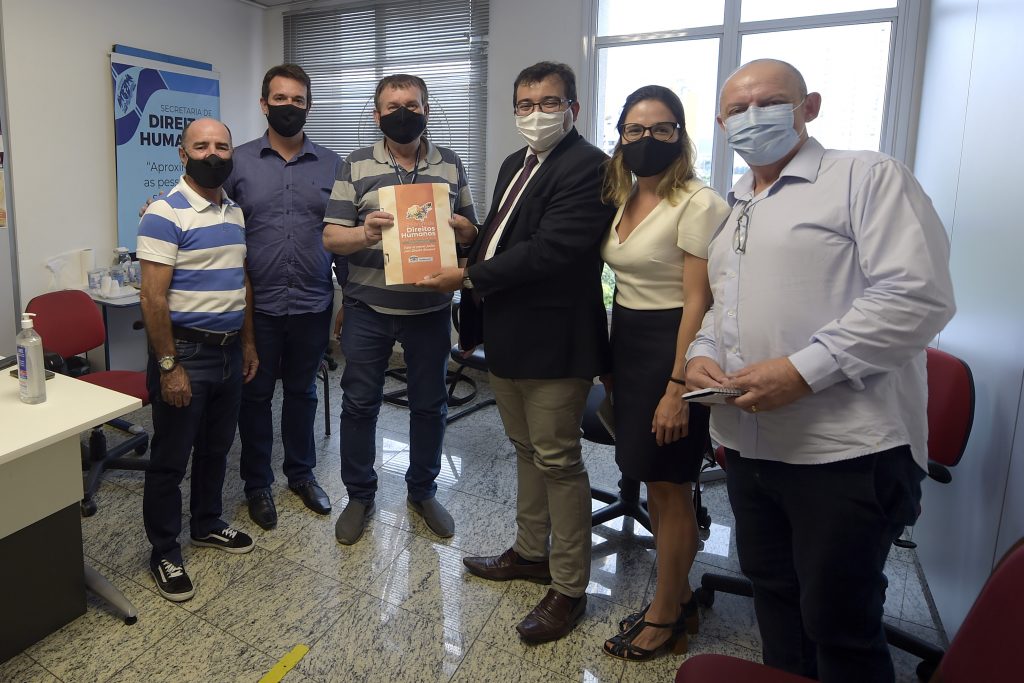 O secretário-adjunto de Direitos Humanos, Martinho Risso, o subsecretário de Acessibilidade e Inclusão, Gilberto Penido, e a chefe de Implantação de Políticas Públicas de Guarulhos, Lígia De Lócco, receberam Bruno Daniel da Silva Oliveira, secretário de Justiça, Cidadania e Direitos Humanos de Ferraz de Vasconcelos, Rodrigo de Freitas, coordenador executivo de Assistência Social, e assessores daquela cidade.