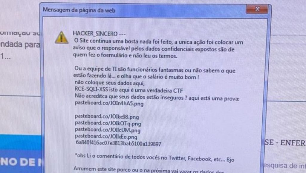 O invasor assinou a mensagem como “hacker sincero”. Disse ainda que tem lido comentários nas redes sociais sobre outras falhas que ele já teria exposto no sistema da Saúde. “Obs Li o comentário de todos vocês no Twitter, Facebook, etc… Bjo (sic)”, escreveu.
