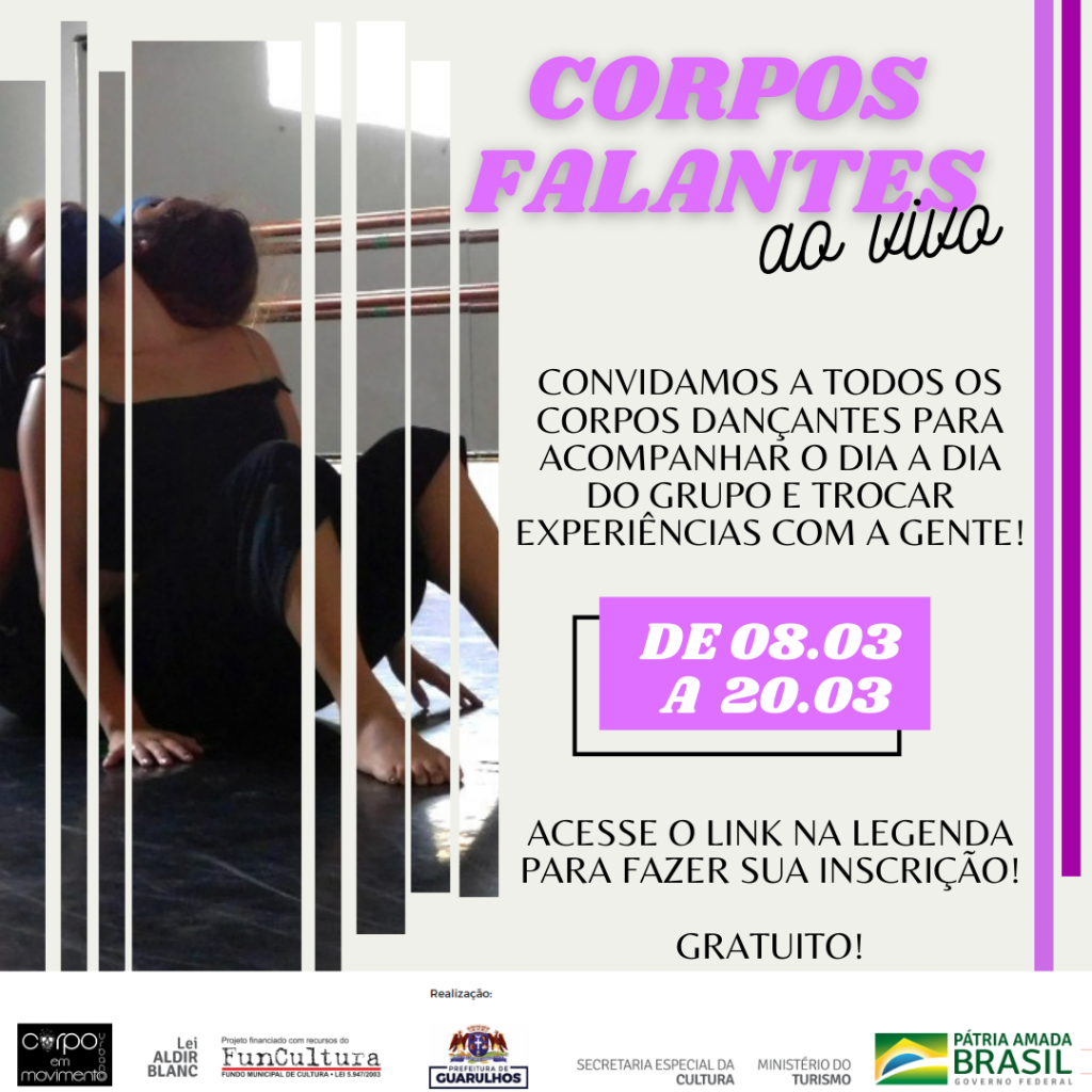 O objetivo do Corpo Urbano em Movimento é compartilhar a vivência e a preparação do grupo, gerando um espaço de troca de experiências com outros bailarinos e corpos dançantes. O projeto Corpos Falantes é fomentado pela Lei Aldir Blanc, por meio de edital do Fundo Municipal de Cultura de Guarulhos, o FunCultura.