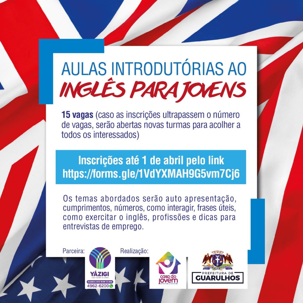A Prefeitura de Guarulhos, por meio da Subsecretaria de Juventude e em parceria com o Yázigi Instituto de Idiomas, oferecerá 15 vagas para aulas de introdução à língua inglesa para jovens de 14 a 29 anos. Caso as inscrições ultrapassem o número de vagas, serão abertas novas turmas para acolher todos os interessados. As inscrições devem ser feitas pelo site https://forms.gle/1VdYXMAH9G5vm7Cj6 até o dia 1º de abril. Os interessados devem informar nome completo, CPF e telefone.