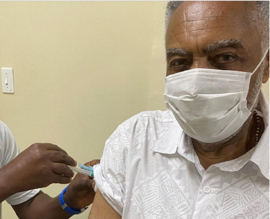 “1ª dose da coronavac aplicada pelos atenciosos profissionais do 5º centro de saúde Clementino Fraga aqui em Salvador. Até que todos estejam em segurança, é fundamental que a gente permaneça com o senso de responsabilidade coletiva, fazendo uso de máscaras e álcool em gel e evitando aglomerações”, concluiu o artista.