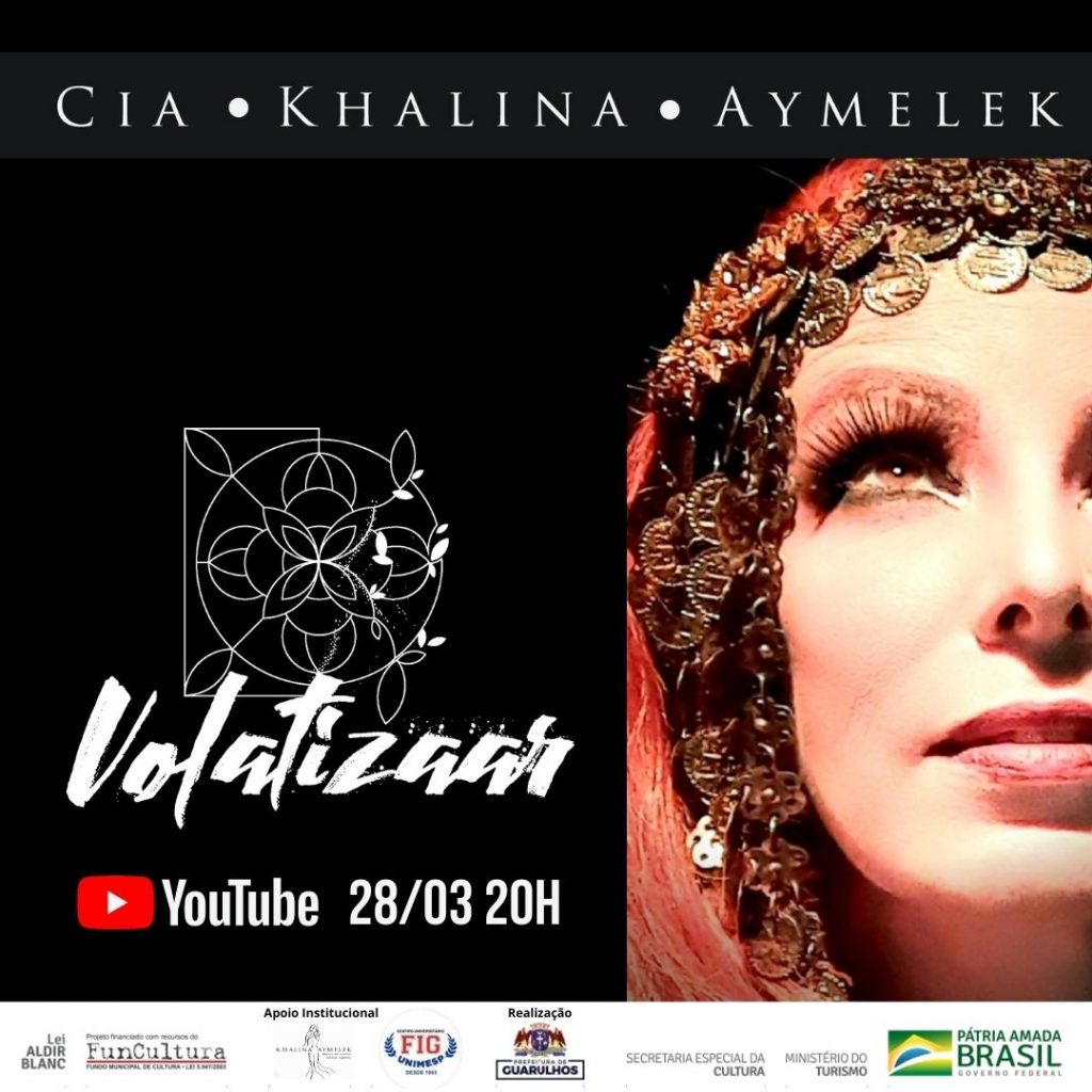 No próximo dia 28 de março, às 20h, a Cia. Khalina Aymelek apresenta a estreia de VOLATIZAAR, espetáculo de dança com música ao vivo transmitido pelo canal da companhia no YouTube, no endereço https://www.youtube.com/user/chrissantovito. O espetáculo foi contemplado por meio de projeto apresentado ao Fundo Municipal de Cultura de Guarulhos, o FunCultura, e é realizado com recursos federais da Lei Aldir Blanc.
