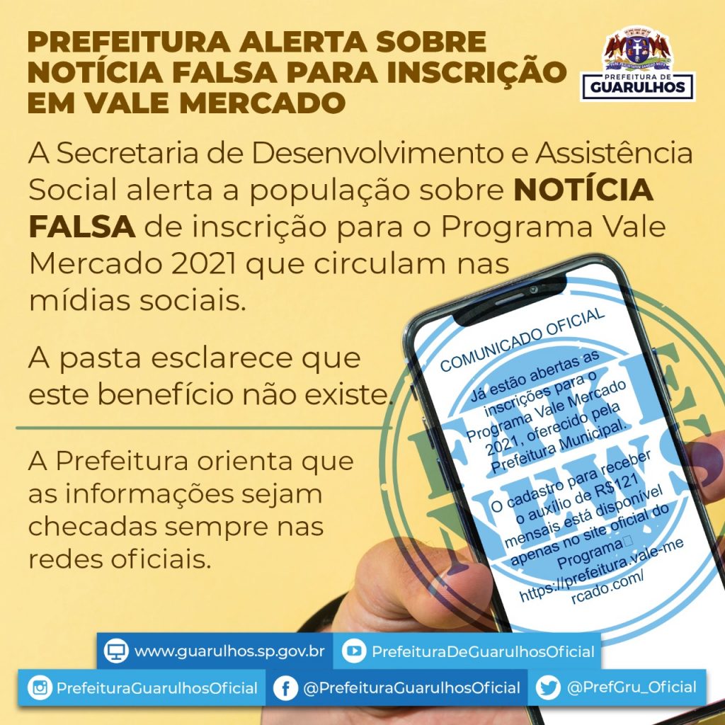 A Secretaria de Desenvolvimento e Assistência Social de Guarulhos alerta a população sobre a notícia falsa de inscrição para um suposto programa Vale-Mercado 2021 que circula nas mídias sociais. A pasta esclarece que tal benefício não existe.