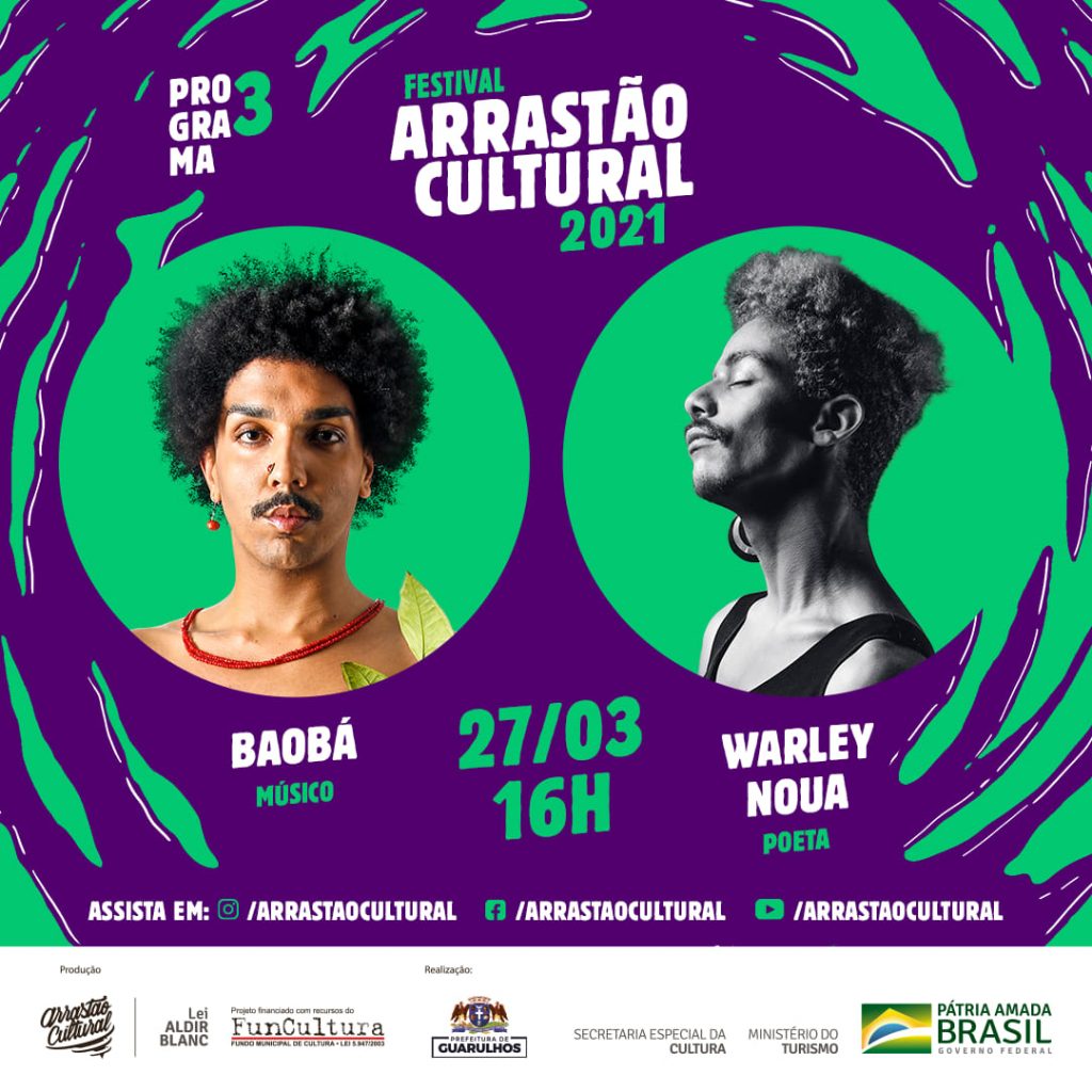 Baobá e Banda e Warley Noua são os artistas convidados do terceiro episódio do Festival Arrastão Cultural, que vai ao ar no próximo sábado (27), às 16h, pelo Facebook (https://www.facebook.com/arrastaocultural/) e pelo YouTube (https://www.youtube.com/channel/UCx908CeOcbekDRha9tOxfqg). Em sua 9ª edição, o Arrastão Cultural tem como objetivo expandir a arte local contemporânea reunindo artistas da cidade de Guarulhos.