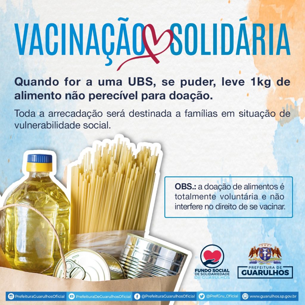 A Prefeitura de Guarulhos lança a campanha Vacinação Solidária, coordenada pelo Fundo Social de Solidariedade, para arrecadar alimentos não perecíveis às famílias em situação de vulnerabilidade social do município. A partir da próxima segunda-feira (29) as pessoas que forem a uma das 69 UBS se vacinar podem colaborar com a doação voluntária de um quilo de alimento não perecível. A doação não é obrigatória e nem interfere no direito de se vacinar.