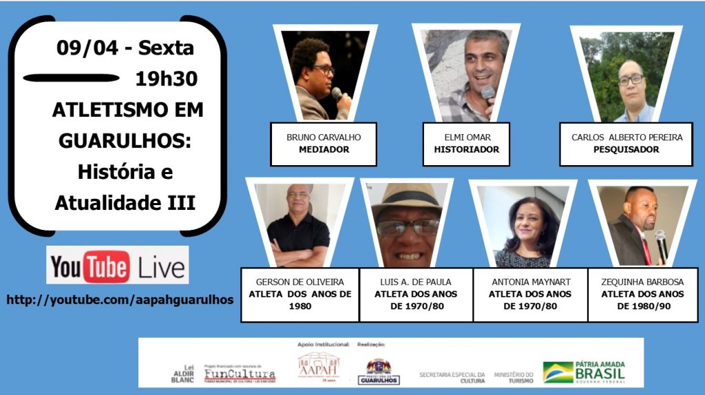 Nesta sexta-feira (9), às 19h30, a Associação Amigos do Patrimônio e Arquivo Histórico (AAPAH) promove a live “Atletismo em Guarulhos: História e Atualidade – Parte III”. O encontro, que conta com a participação do atleta olímpico Zequinha Barbosa, aborda o histórico da modalidade na cidade em um período que vai dos anos 1970 ao final da década de 1990. A transmissão da live será feita pelo canal da AAPAH no YouTube (youtube.com/aapahguarulhos).