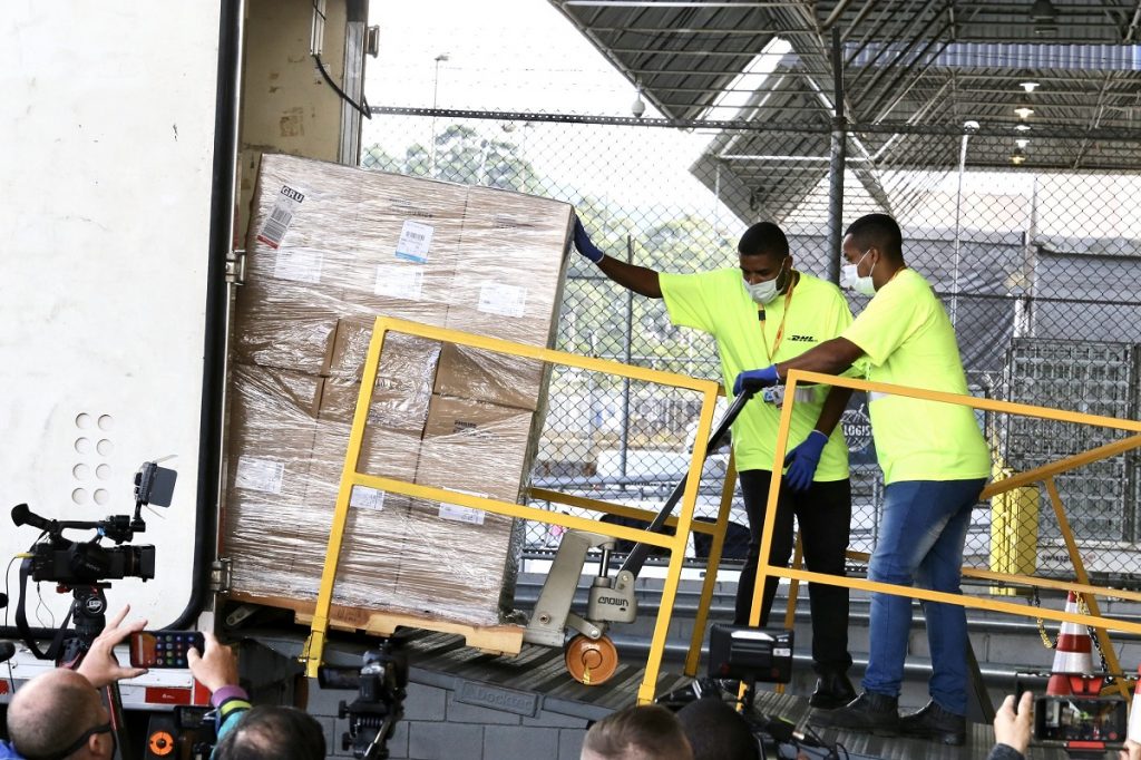Os secretários de Estado Patricia Ellen (Desenvolvimento Econômico), Jean Gorinchteyn (Saúde) e Marco Vinholi (Desenvolvimento Regional) acompanharam a retirada dos equipamentos no setor de cargas do Aeroporto Internacional de Guarulhos.