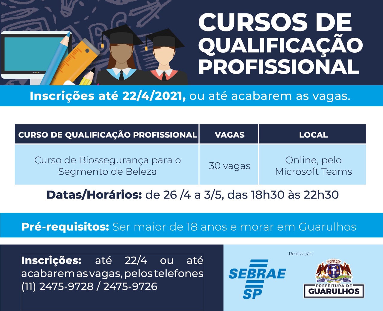 A Secretaria do Trabalho de Guarulhos, em parceria com o Serviço Brasileiro de Apoio às Micro e Pequenas Empresas (Sebrae), receberá até o dia 22 de abril as inscrições para o curso Biossegurança para o Segmento de Beleza. São 30 vagas disponíveis e as inscrições podem ser feitas pelos telefones 2475-9728/9726. É necessário ser maior de 18 anos e morar em Guarulhos.