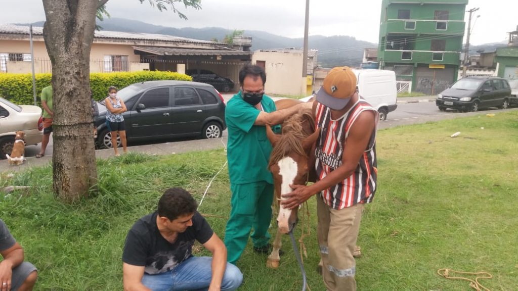 Uma equipe do Departamento de Proteção Animal (DPAN) de Guarulhos socorreu nesta terça-feira (13) uma égua de aproximadamente cinco anos que se contorcia de dor em uma área pública às margens da estrada Guarulhos-Nazaré, região do bairro Cidade Soberana. A ação contou com o auxílio voluntário de Dagonaldo Saraiva de Oliveira, médico veterinário especialista em animais de grande porte da Universidade de Guarulhos.