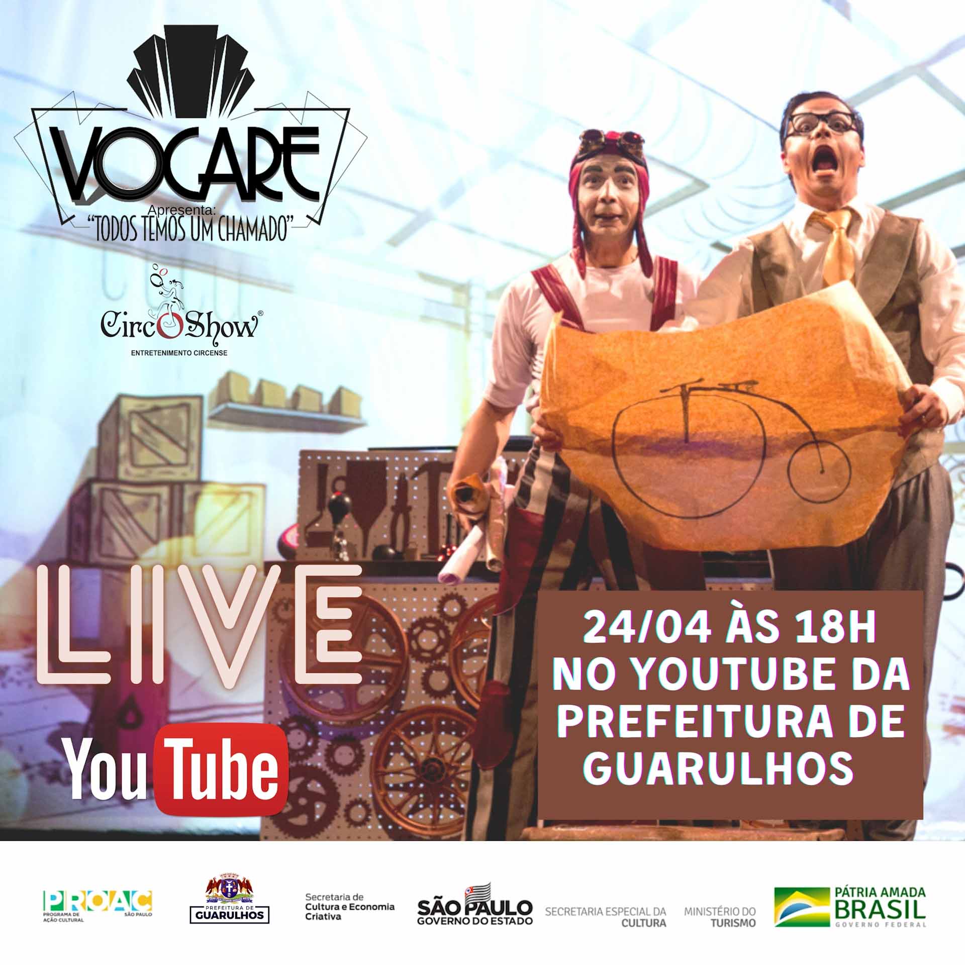 No próximo sábado (24), às 18h, a Companhia CircoShow apresenta VOCARE – Todos Temos Um Chamado, espetáculo gratuito que une a magia e o sobre-humano do circo com a narrativa do teatro. O evento conta com o apoio da Prefeitura de Guarulhos e será transmitido pelo YouTube no endereço https://www.youtube.com/channel/UC60j17Hvlg-poRLOtvUfUrw. A classificação é livre.
