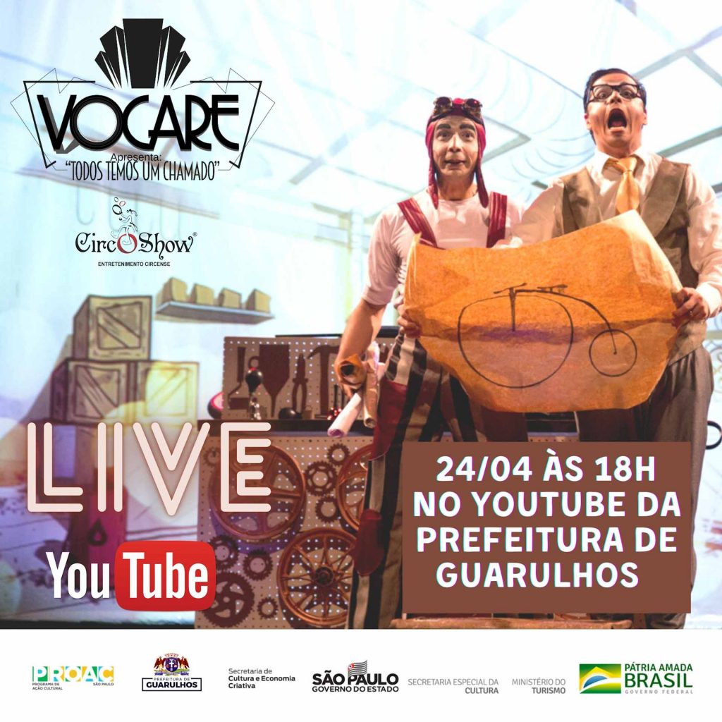 No próximo sábado (24), às 18h, a Companhia CircoShow apresenta VOCARE – Todos Temos Um Chamado, espetáculo gratuito que une a magia e o sobre-humano do circo com a narrativa do teatro. O evento conta com o apoio da Prefeitura de Guarulhos e será transmitido pelo YouTube no endereço https://www.youtube.com/channel/UC60j17Hvlg-poRLOtvUfUrw. A classificação é livre.