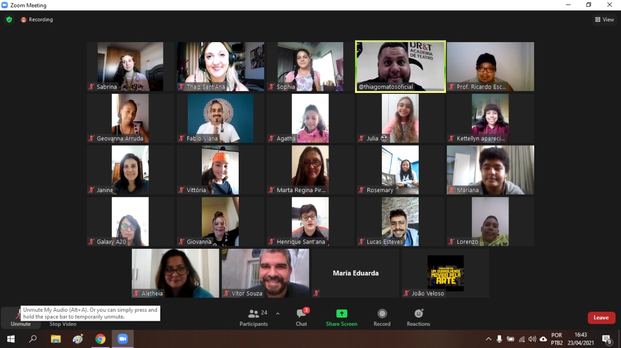 Na última sexta-feira (23) alunos do Projeto Teatro Escola 360 dos CEUs de Guarulhos participaram de workshop virtual de jogos teatrais, improvisações, brincadeiras e vivências teatrais com o ator Thiago Matos. A atividade integra um conjunto de ações do projeto que objetiva o exercício da cidadania por meio da ampliação do repertório cultural.