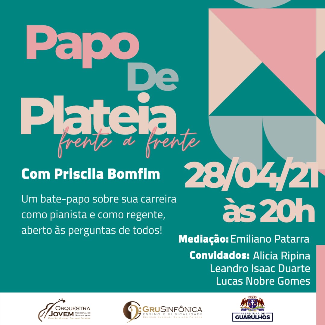 A maestrina e pianista portuguesa Priscila Bomfim, regente do Theatro Municipal do Rio de Janeiro, é a convidada do episódio de estreia do Papo de Plateia Frente a Frente. O time de entrevistadores é composto pelo pianista guarulhense Leandro Isaac Duarte, a estudante de regência e estagiária das orquestras de Guarulhos Alicia Ripina e Lucas Nobre Campos, aluno de piano do Conservatório Municipal de Guarulhos.
