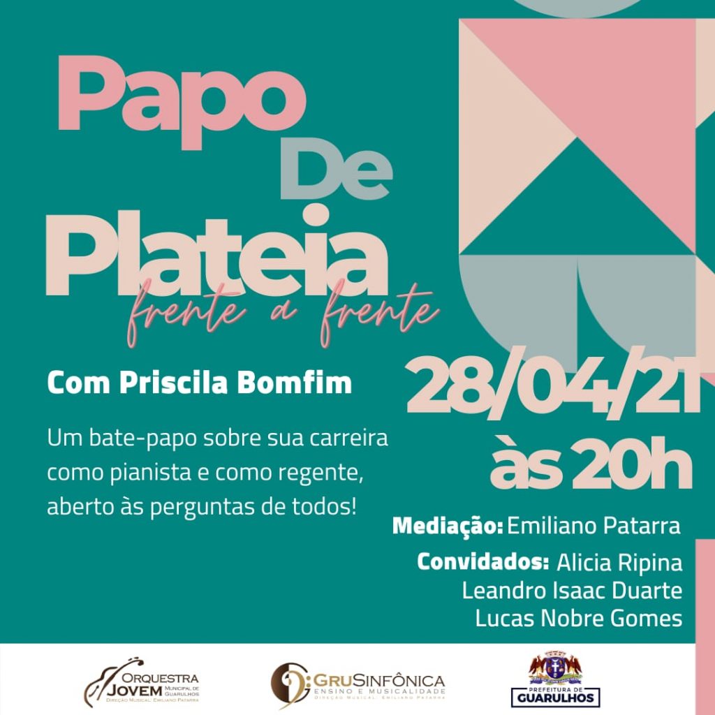 A maestrina e pianista portuguesa Priscila Bomfim, regente do Theatro Municipal do Rio de Janeiro, é a convidada do episódio de estreia do Papo de Plateia Frente a Frente. O time de entrevistadores é composto pelo pianista guarulhense Leandro Isaac Duarte, a estudante de regência e estagiária das orquestras de Guarulhos Alicia Ripina e Lucas Nobre Campos, aluno de piano do Conservatório Municipal de Guarulhos.