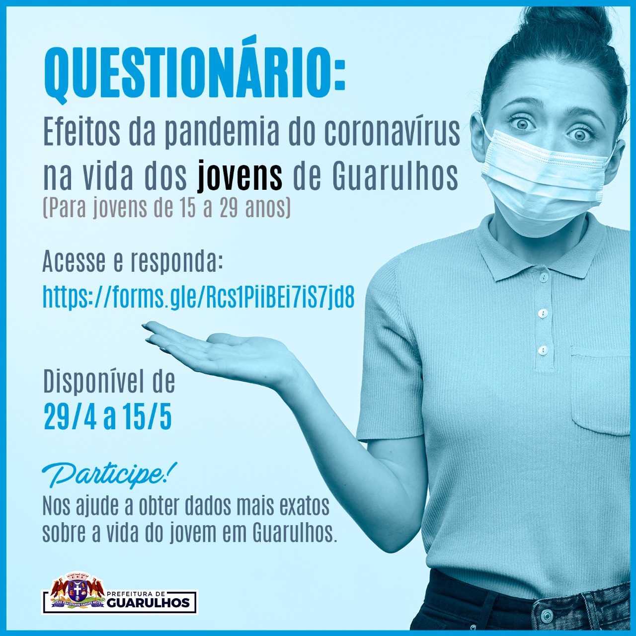 A Secretaria de Direitos Humanos (SDH) de Guarulhos realiza entre esta quinta-feira (29) e 15 de maio uma pesquisa sobre os efeitos da pandemia do coronavírus na vida dos jovens da cidade. O formulário poderá ser preenchido pelo link https://forms.gle/Rcs1PiiBEi7iS7jd8. O objetivo é coletar informações sobre os impactos das mudanças impostas no dia a dia de pessoas entre 15 e 29 anos, que serão analisadas e publicadas na próxima edição do Relatório Analítico de Direitos Humanos, em agosto, e que terá como pauta a juventude.