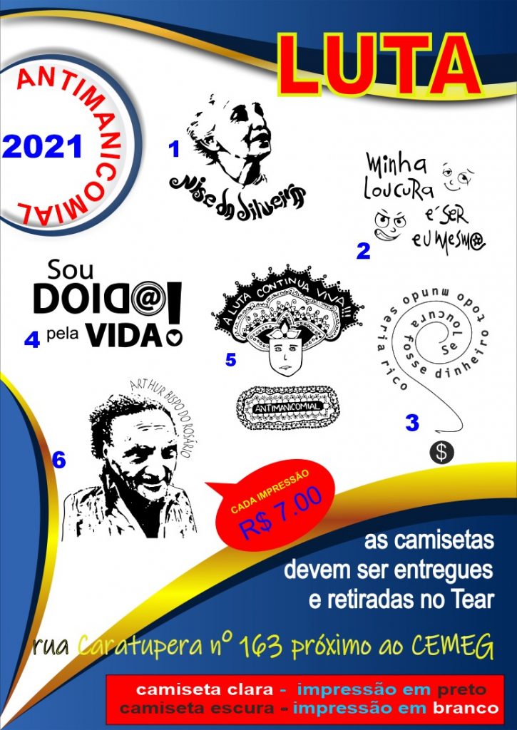 Durante todo o mês de maio os serviços de saúde irão desenvolver atividades e ações comemorativas com os usuários e familiares através de produções artísticas, culturais, artesanais, cultivo de horta, palestras, rodas de conversas, exibição de filmes, painéis de fotos, bazar da luta antimanicomial, confecção e vendas de camisetas temáticas, como é o caso do Tear. Neste serviço, localizado na rua Carutapera, 163 (Vila Augusta), além de comprar uma peça pronta as pessoas ainda terão a opção de adquirir somente as estampas criadas sobre o tema ao custo de R$ 7 cada.