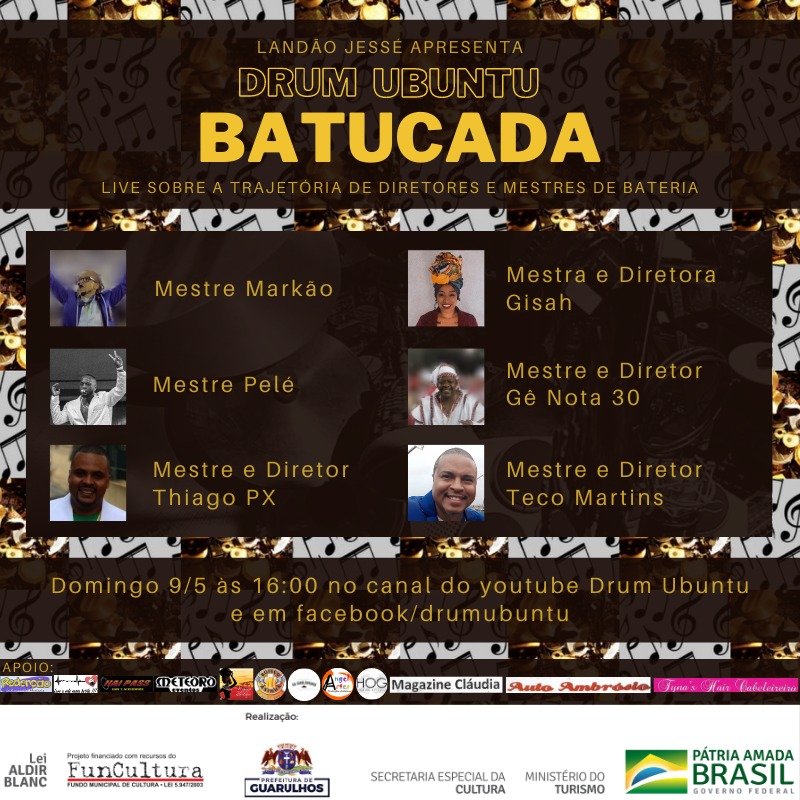 Uma temporada que primou por apresentações musicais de diferentes artistas, com bate-papos descontraídos e cheios de histórias dos palcos, estúdios e bastidores da música. No próximo domingo (9), às 16h, o projeto Drum Ubuntu apresenta batucada de encerramento com a participação de diretores e mestres de bateria, evento virtual transmitido pelas redes sociais do projeto no YouTube e no Facebook.