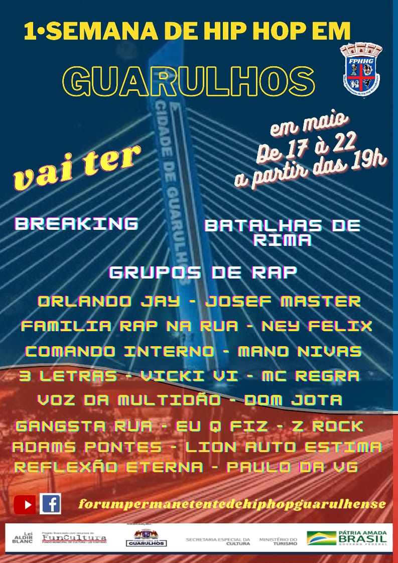 Com o objetivo de reunir artistas de rap e break dance dos quatro cantos da cidade, o Fórum Permanente de Hip Hop Guarulhense criou a 1° Semana do Hip Hop em Guarulhos, evento que acontece entre os dias 17 e 22 de maio, transmitido pelas redes sociais do coletivo no Facebook, Instagram e YouTube e pela Rádio Resistência FM, em 103.9.