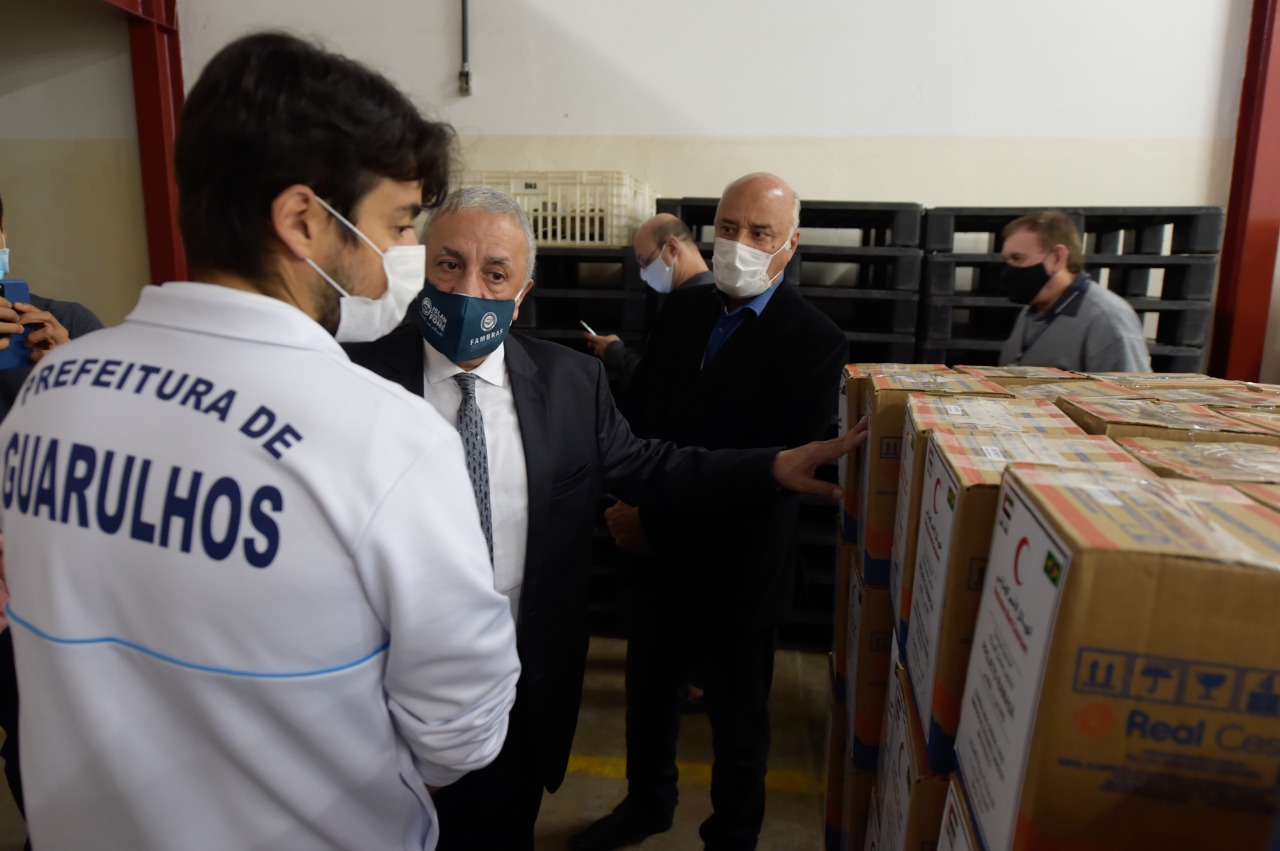 O Banco de Alimentos de Guarulhos recebeu nesta quinta-feira (13) a doação de 600 cestas básicas e 600 frangos resfriados da Federação das Associações Muçulmanas do Brasil (Fambras). O prefeito Guti recebeu os itens do presidente da Fambras, Mohamed Hussein El Zoghbi. Participaram do encontro o secretário de Desenvolvimento e Assistência Social, Alex Viterale, o subsecretário de Direitos Humanos, Abdo Mazloum, e a presidente do Fundo Social de Solidariedade, Elen Farias.