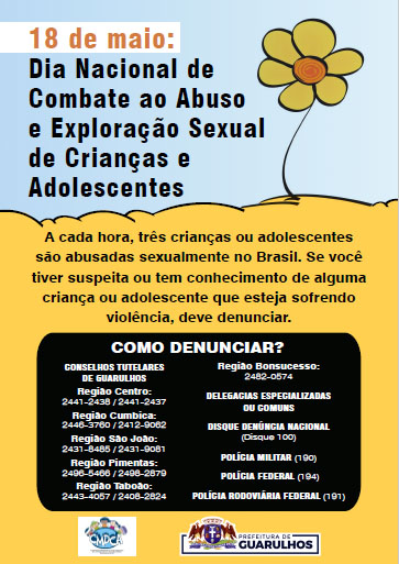 A Prefeitura de Guarulhos realiza nesta terça-feira (18), Dia Nacional de Combate ao Abuso e Exploração Sexual de Crianças e Adolescentes, uma ação de orientação à população sobre o tema. Em pontos estratégicos do município serão distribuídos 1.500 kits contendo um panfleto informativo com telefones para denúncias, duas máscaras de tecido e álcool em gel.