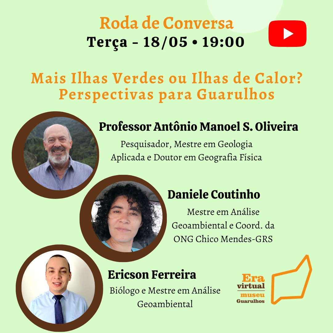 Nesta terça-feira (18), às 19h, o projeto Era Virtual Museu Guarulhos apresenta roda de conversa virtual com ambientalistas sobre o tema Mais Ilhas Verdes ou Ilhas de Calor? – Perspectivas para Guarulhos. O encontro online é transmitido pelo canal do projeto no YouTube, no endereço https://www.youtube.com/watch?v=ZIT4NgEaZNg.