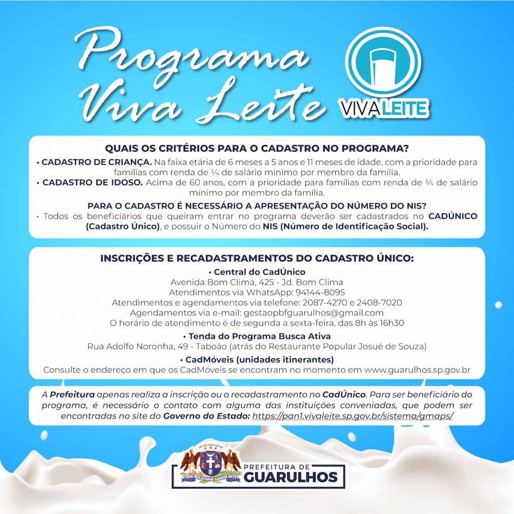 Famílias inscritas no Cadastro Único para Programas Sociais (CadÚnico) com renda de até 25% do salário mínimo (R$ 1.100) por pessoa, compostas por idosos acima de 60 anos ou com crianças entre seis meses e cinco anos e 11 meses de idade, podem se inscrever no programa Viva Leite. Iniciativa do governo estadual, o programa entrega 15 litros de leite mensais às famílias por meio de instituições conveniadas. A Prefeitura de Guarulhos somente realiza a inscrição ou o recadastramento no CadÚnico. Para ser beneficiário do programa é necessário entrar em contato com uma das instituições conveniadas, que podem ser encontradas no site do Governo do Estado: https://pan1.vivaleite.sp.gov.br/sistema/gmaps/.