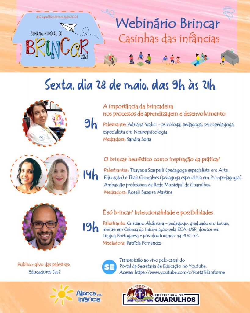 Na próxima sexta-feira (28), a partir das 9h, acontece o Webinário da Semana Mundial do Brincar com a participação de diversos especialistas para debater a importância do brincar. A videoconferência é destinada aos educadores e tem como foco refletir sobre a importância da escola em proporcionar um tempo de infância mais alegre e desafiador através das brincadeiras, a valorização dos espaços educacionais coletivos, além de estimular a liberdade de criação em diferentes faixas etárias. A transmissão ocorrerá ao vivo pelo canal da Secretaria de Educação no YouTube: https://www.youtube.com/channel/UC-1jfk67HIfe7q2cVbb4oJg.