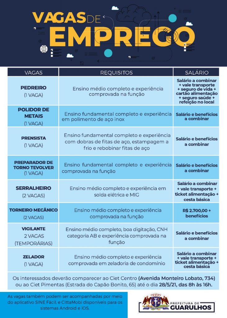 O Centro Integrado de Emprego, Trabalho e Renda (Ciet), órgão da Secretaria do Trabalho de Guarulhos, divulgou nesta quarta-feira (26) 25 vagas de emprego em diversas áreas de atuação. Os interessados, desde que estejam dentro do perfil solicitado nos requisitos, deverão comparecer ao Ciet Centro (avenida Monteiro Lobato, 734) ou à unidade Pimentas (estrada do Capão Bonito, 65) até o dia 28 de maio, das 8h às 16h.