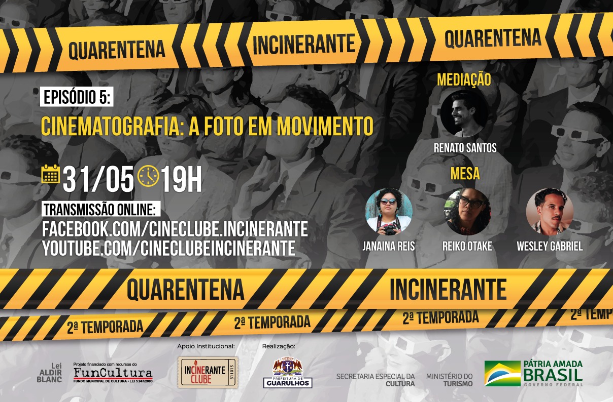 Cinematografia: A Foto em Movimento é o tema do último episódio do Quarentena Incinerante, que vai ao ar na próxima segunda-feira (31), às 19h. O bate-papo virtual integra uma série de encontros que tem por objetivo aprofundar discussões sobre a sétima arte. O evento é transmitido pelas redes sociais do Cineclube Incinerante no Facebook e no YouTube, com recursos de interatividade disponíveis para garantir a participação dos internautas.