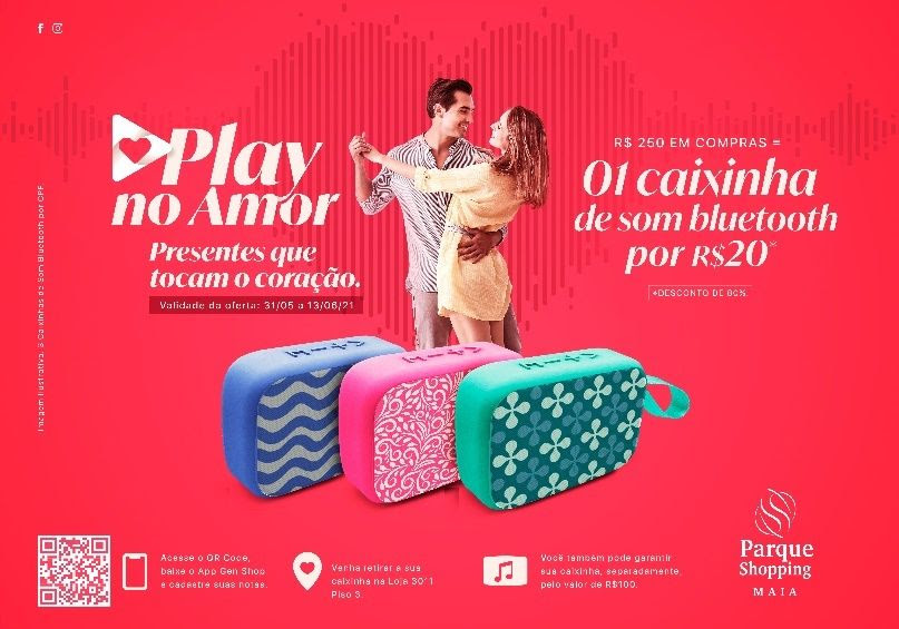 No ritmo do dia dos namorados, o Parque Shopping Maia traz uma novidade que vai embalar o romance dos casais: a campanha Play no Amor, que a cada R$250,00 em compras os clientes garantem 1 caixinha de som bluetooth por mais R$20,00.