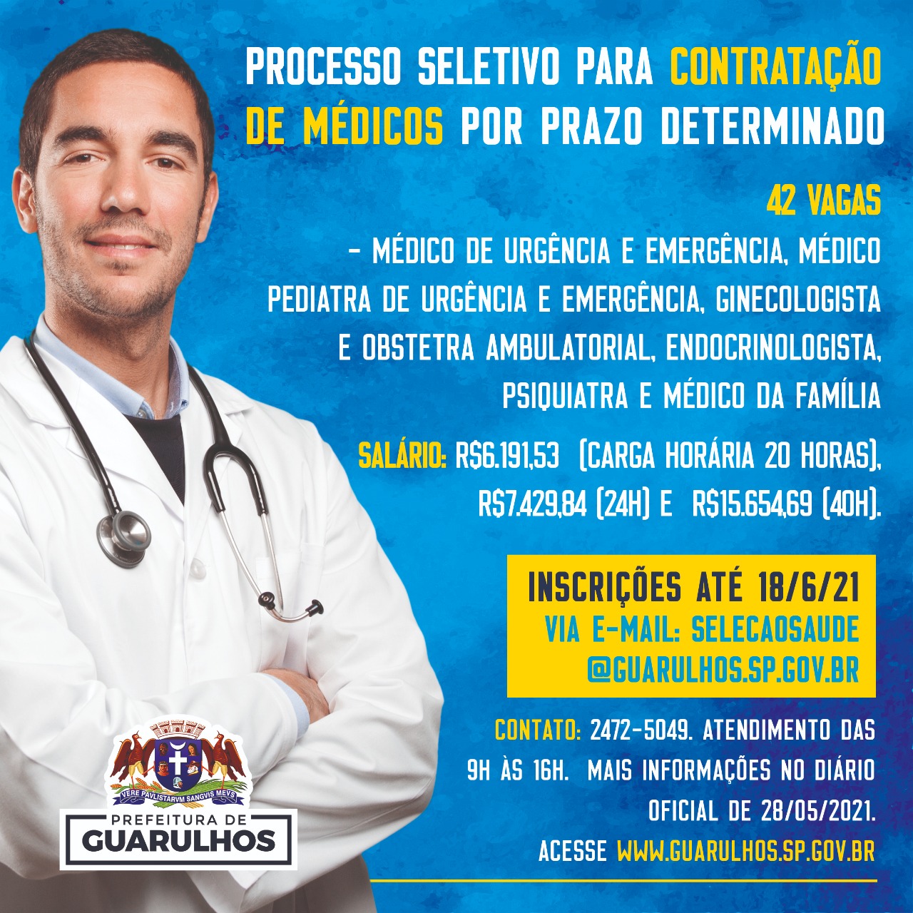 A Prefeitura de Guarulhos está com processo seletivo aberto para a contratação de 42 médicos, conforme publicado no Diário Oficial 049/2021-GP desta sexta-feira (28), editais 028, 033, 034, 035 e 036, página 52 em diante. As vagas são para médico de urgência e emergência (13 vagas), pediatra de urgência e emergência (14), ginecologista e obstetra ambulatorial (2), endocrinologista (4), psiquiatra (6) e médico da família (3). As inscrições podem ser realizadas até 18 de junho de 2021. Os salários variam de R$ 6.191,53 a R$ 15.654,69 para cargas horárias semanais de 20 a 40 horas.