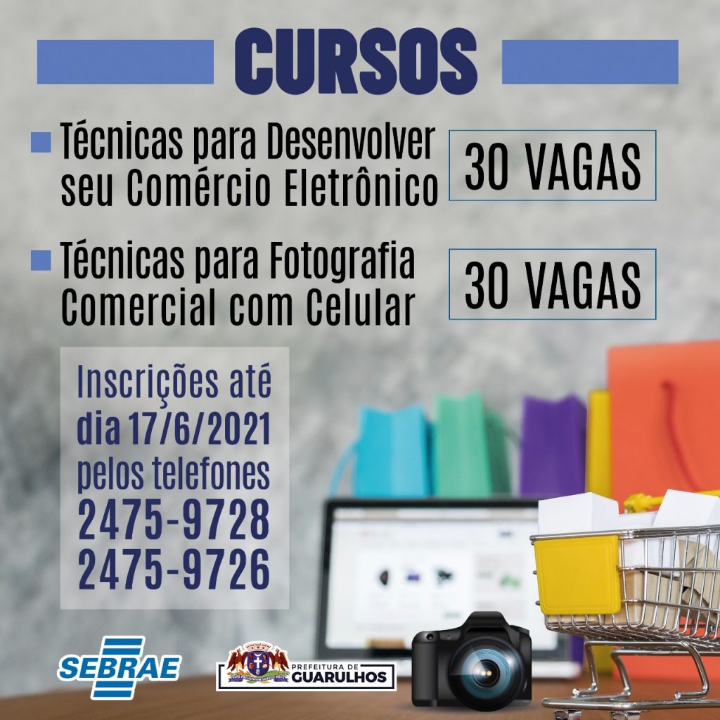 Até 17 de junho a Secretaria do Trabalho de Guarulhos, em parceria com o Sebrae, receberá as inscrições para os cursos a distância Técnicas para Desenvolver seu Comércio Eletrônico e Técnicas para Fotografia Comercial com Celular. Cada um tem 30 vagas disponíveis e as inscrições devem ser feitas pelos telefones 2475-9728/9726