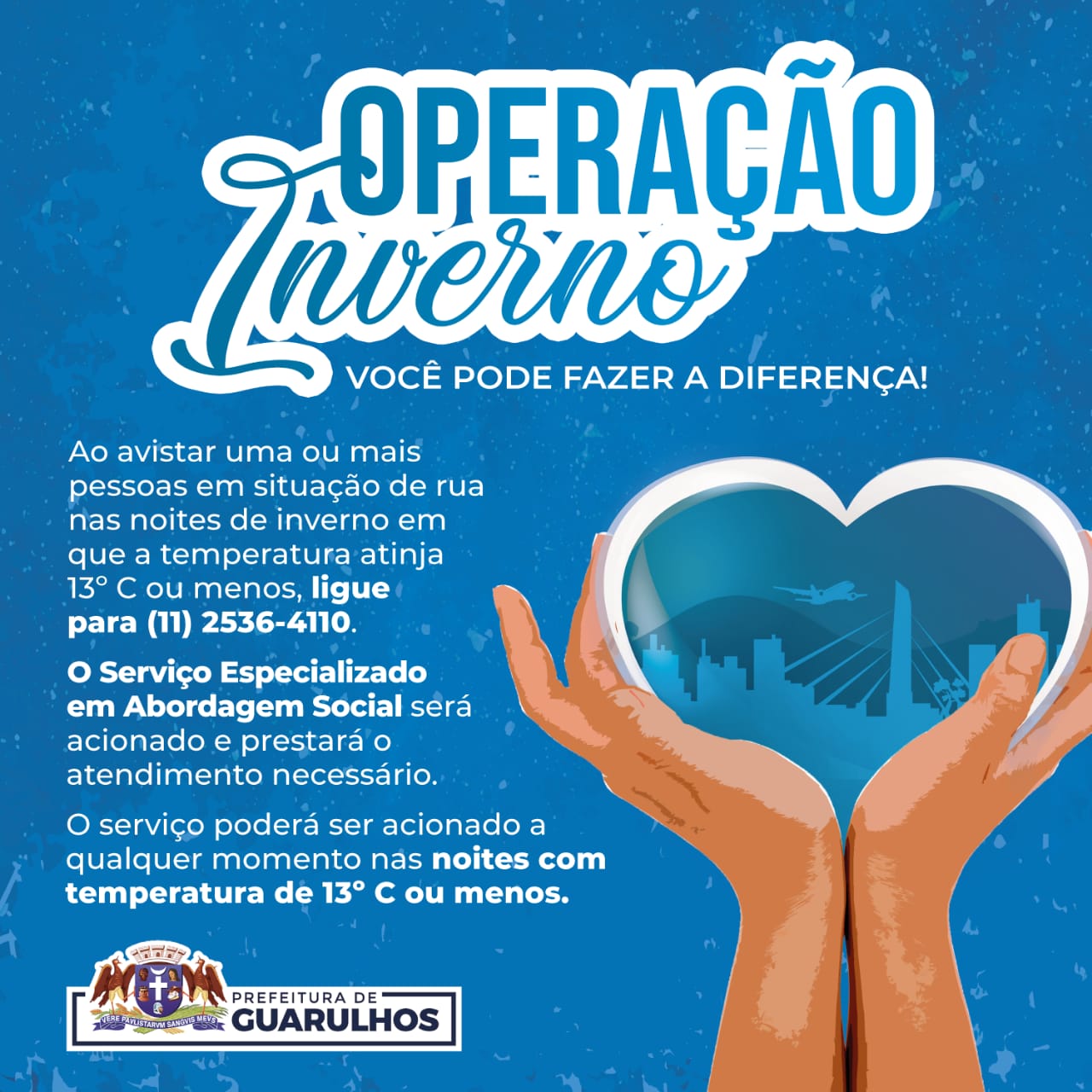 A Prefeitura de Guarulhos começa nesta terça-feira (1º) a Operação Inverno 2021, que tem por objetivo acolher as pessoas em situação de rua e que amplia para quatro o total de equipes do Serviço Especial de Abordagem Social (Seas). O horário das equipes também foi estendido das 9h até a meia-noite desde o último dia 24. Além disso, sempre que a temperatura estiver igual ou abaixo de 13ºC, a população poderá acionar o Seas pelo telefone 2536-4110.