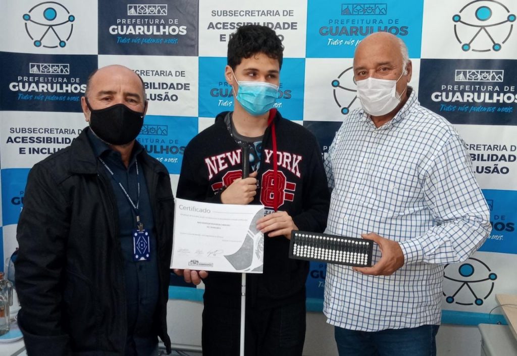 Dois alunos com deficiência visual do projeto Práticas Educativas para Inclusão Social (Peis) receberam na manhã desta segunda-feira (14) os certificados pela conclusão do curso online de soroban, nome dado ao ábaco japonês utilizando por pessoas com deficiência para realizar cálculos. Esta foi a primeira turma online, já que o curso, oferecido pela Secretaria de Direitos Humanos (SDH) de Guarulhos, precisou ser adaptado por conta da pandemia.