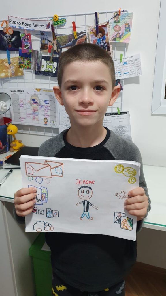 Depois dos desenhos, a história não parou por aí. A partir de uma ideia que viu nas redes sociais, Elaine mandou fazer um boneco Jerome, personagem do livro. “Decidimos dar continuidade à proposta iniciada no programa e foi feito um bonequinho do desenho, na visão do Pedro, de acordo com a imaginação dele. E deu muito certo”, contou.