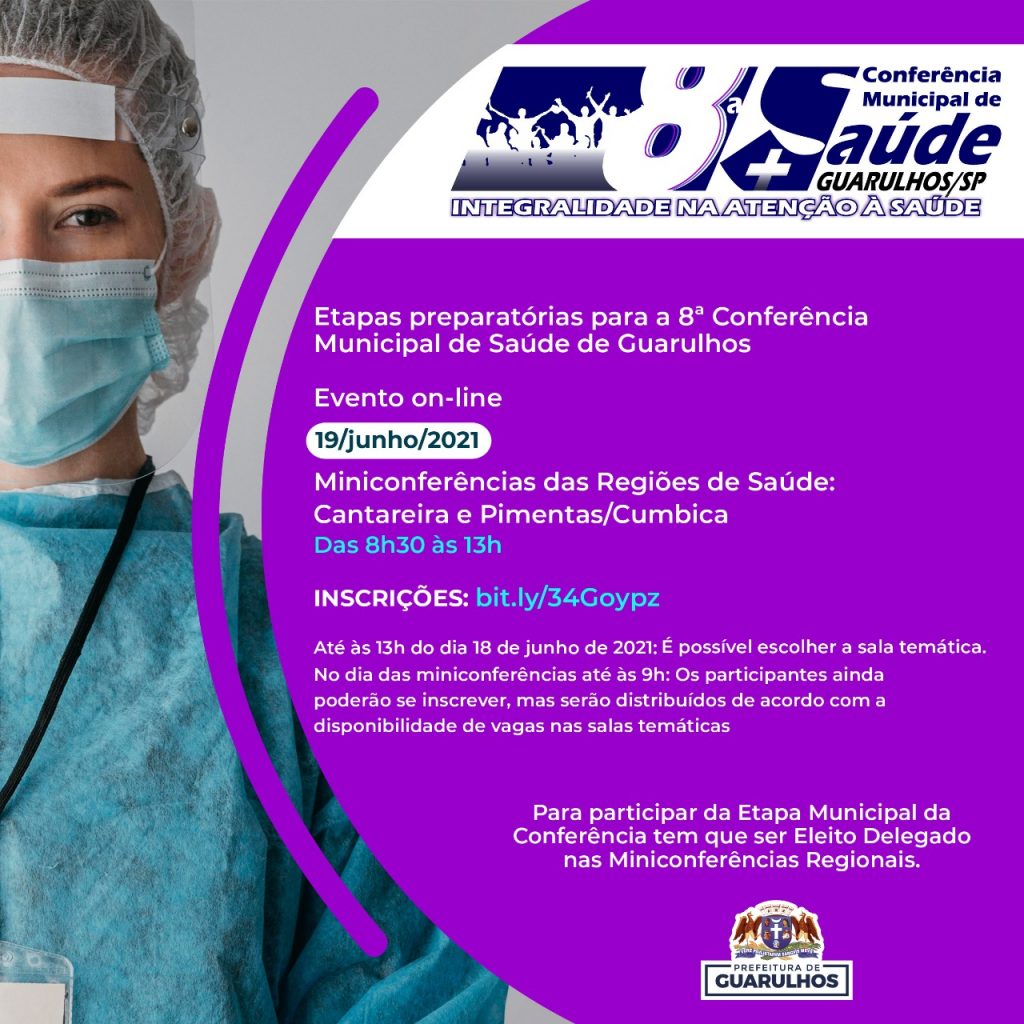 Neste sábado (19), das 8h30 às 13h, o Conselho Municipal de Saúde e a Secretaria da Saúde de Guarulhos darão continuidade às etapas preparatórias da 8ª Conferência Municipal de Saúde com a realização das miniconferências das regionais Cantareira e Pimentas/Cumbica. Interessados em debater e elaborar propostas para melhorias do SUS nessas regiões devem se inscrever pelo link bit.ly/34Goypz para participar. Os eventos serão realizados simultaneamente de forma online.