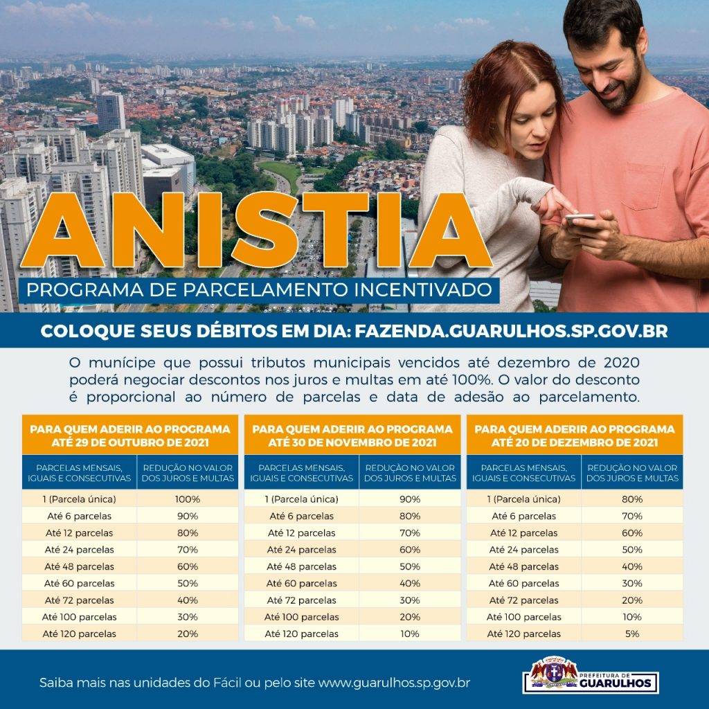 A Prefeitura de Guarulhos liberou nesta segunda-feira (21) as adesões ao Programa de Parcelamento Incentivado (PPI) 2021 (lei 7.910) de forma totalmente online, por meio do site fazenda.guarulhos.sp.gov.br. É possível também aderir à anistia na Rede Fácil de Atendimento ao Cidadão mediante agendamento pelo telefone 2475-8651 ou por meio da página facilagendamento.guarulhos.sp.gov.br.