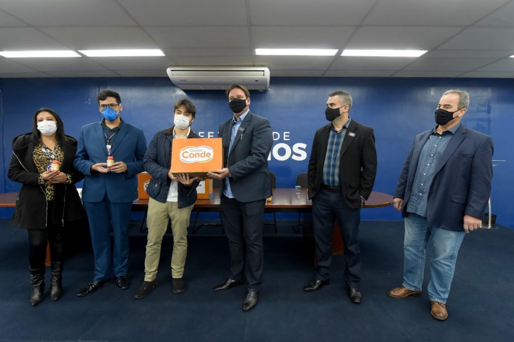 A Prefeitura de Guarulhos recebeu nesta segunda-feira (21) mil cestas básicas e dois mil frascos de complexo vitamínico doados pelo grupo Farma Conde. O prefeito Guti, acompanhado da presidente do Fundo Social de Solidariedade, Elen Farias, e do secretário de Desenvolvimento e Assistência Social (SDAS), Alex Viterale, recebeu os itens do presidente da empresa, Mario Muniz, no auditório do Paço Municipal.