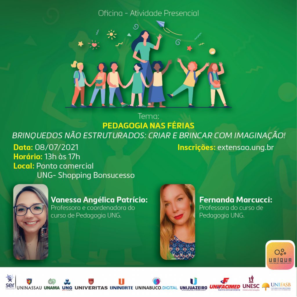 A Universidade UNG promove, nos dias 7 e 8 de julho, por meio do curso de Pedagogia, a oficina “Pedagogia nas Férias – Brinquedos não Estruturados: criar e brincar com imaginação”. O evento tem como objetivo principal promover atividades extensionistas para a comunidade, integradas à prática pedagógica por meio de atividades lúdicas.