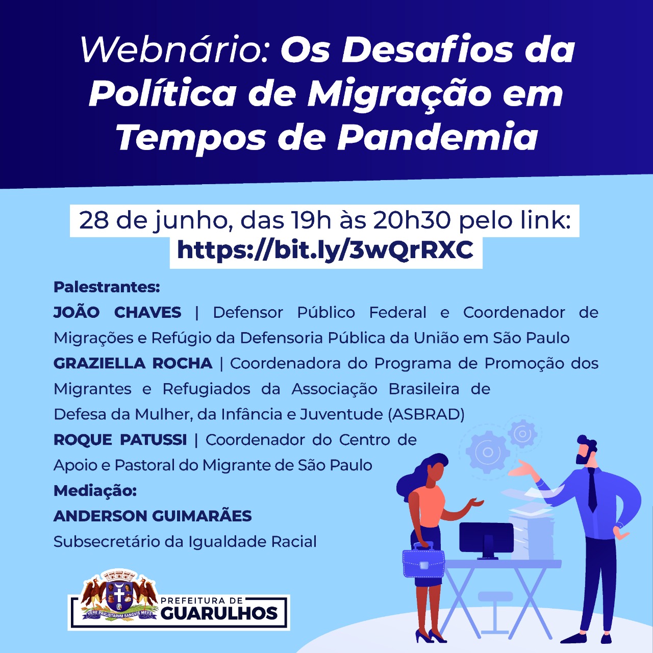 Em alusão ao Dia Mundial do Refugiado e ao Dia do Imigrante, celebrados respectivamente em 20 e 25 de junho, a Prefeitura de Guarulhos realizará na próxima segunda-feira (28) o webinário Os Desafios da Política de Migração em Tempos de Pandemia. Organizado pela Secretaria de Direitos Humanos (SDH), por meio da Subsecretaria da Igualdade Racial, o evento será transmitido pelo YouTube (https://bit.ly/3wQrRXC) a partir das 19h.