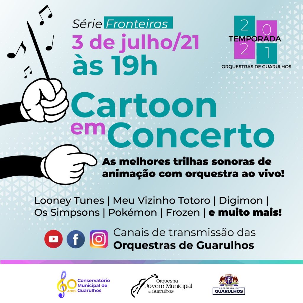 Mesclar a sonoridade da orquestra a outros gêneros de criação musical ou formas de manifestação artística. No próximo dia 3 de julho, sábado, às 19h, a Orquestra Jovem Municipal de Guarulhos apresenta Cartoon em Concerto, concerto digital que integra a Série Fronteiras da Temporada 2021 das orquestras de Guarulhos. Iniciativa da Prefeitura por meio da Secretaria de Cultura, o evento é transmitido pelas redes sociais das orquestras no YouTube e no Facebook.