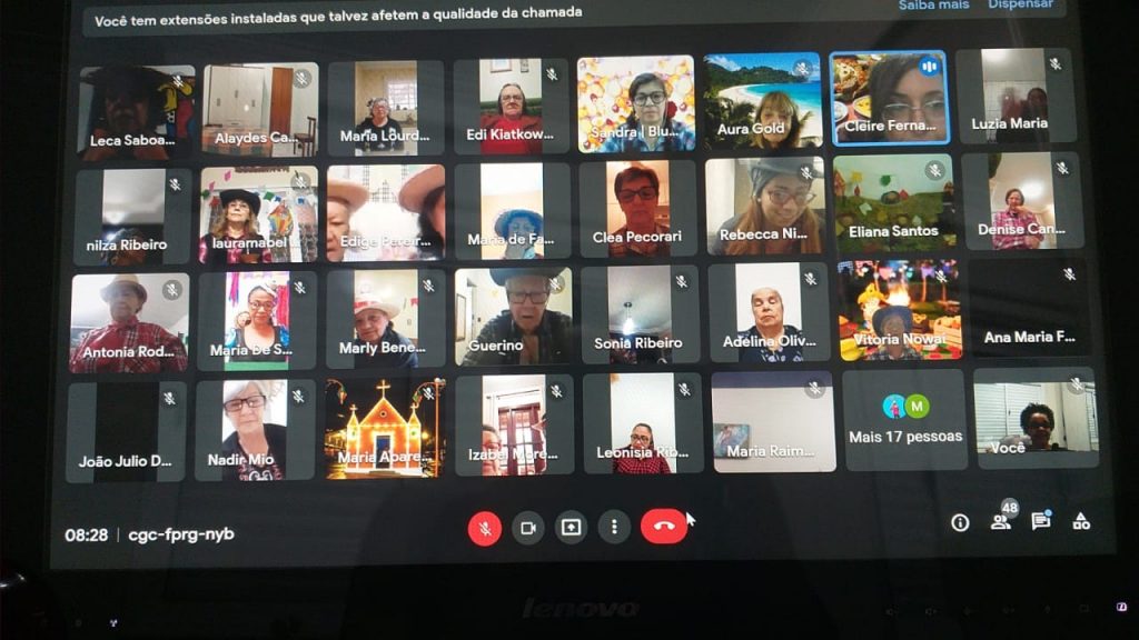O arraial junino virtual promovido nesta terça-feira (29) pelo Centro de Convivência do Idoso (CCI) Santa Mena reuniu 51 pessoas da melhor idade (acima de 60 anos). Trajando chapéus de palha e camisas xadrez, os assistidos pelos dois CCIs da Prefeitura (Gopoúva e Santa Mena) dançaram, cantaram, declamaram poesias e apresentaram pratos típicos, entre outras atividades, pela internet por duas horas e meia.