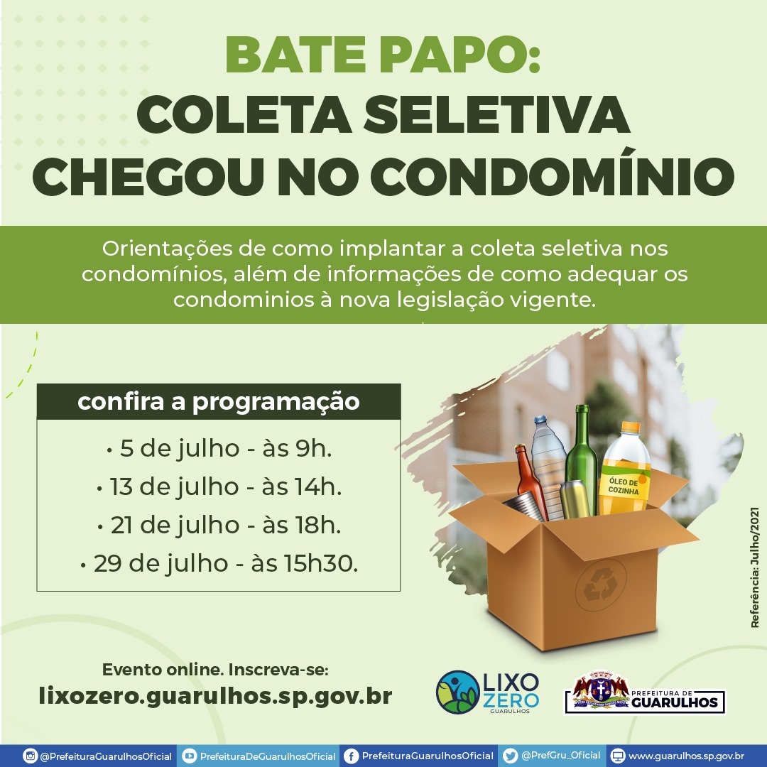 A Prefeitura de Guarulhos promove nas próximas semanas quatro encontros virtuais para orientar moradores e gestores de condomínios residenciais sobre a implantação da coleta seletiva e o engajamento da comunidade quanto à separação e à destinação correta de resíduos. Os bate-papos acontecem segunda-feira (5), às 9h, terça-feira (13), às 14h, quarta-feira (21), às 18h, e na quinta-feira (29), às 15h30. Para receber o link de participação pelo Google Meet é necessário se inscrever em https://bit.ly/3Amm3re.