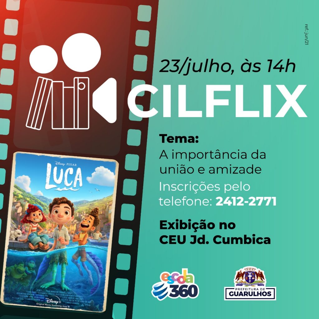 O CEU Cumbica apresentará na sexta-feira (23) às 14h, o filme Luca, acompanhado de pipoca e bate-papo sobre a importância da união e da amizade. A iniciativa é parte do projeto Cilfix, promovido pelo Centro de Incentivo à Leitura (CIL) daquele CEU com o apoio da Escola 360.