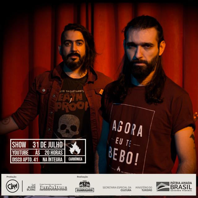 Uma experiência híbrida de show musical com audiovisual. No próximo sábado (31), às 20h, a banda de rock guarulhense Carbônica apresenta show online de seu novo álbum, Apartamento 41, lançado em junho. O disco, segundo trabalho da banda, é um projeto realizado com recursos da Lei Aldir Blanc, por meio do FunCultura. A transmissão acontece pelo YouTube (https://www.youtube.com/carbonica).