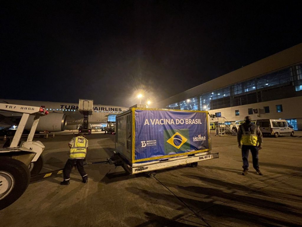 Um carregamento com mais 2 milhões de doses prontas de vacina CoronaVac, contra a covid-19, chegou na noite de ontem (16) no Aeroporto Internacional de Guarulhos.