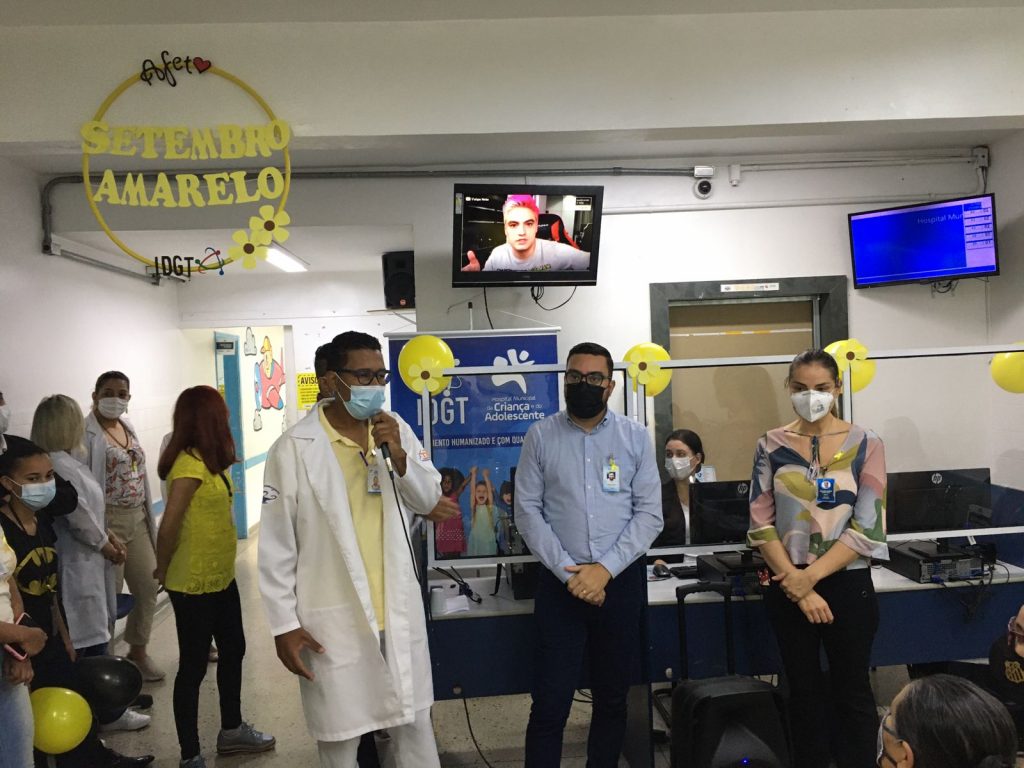 O Hospital Municipal da Criança e do Adolescente (HMCA), em Guarulhos, administrado pelo IDGT, iniciou na última segunda-feira (13), a campanha “Setembro Amarelo”, voltada à prevenção do suicídio. Na abertura, o diretor-geral da unidade, Leandro Bomfim; a diretora técnica Anna Karina; o gerente de Humanização, Fabiano Viana; e o integrante da educação continuada, Luiz Fernando Borges, falaram sobre a importância e a necessidade da campanha.
