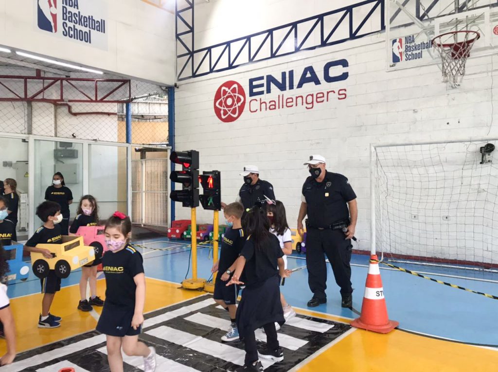 Cerca de 120 estudantes de três a seis anos participaram de uma atividade educativa coordenada pela Inspetoria de Patrulhamento de Trânsito da Guarda Civil Municipal (GCM) no Colégio Eniac na última semana. Em um cenário lúdico montado pela equipe, as crianças simularam diversas situações do dia a dia nas ruas com faixas de pedestres, carros de brinquedo, semáforos, cones e outras sinalizações.