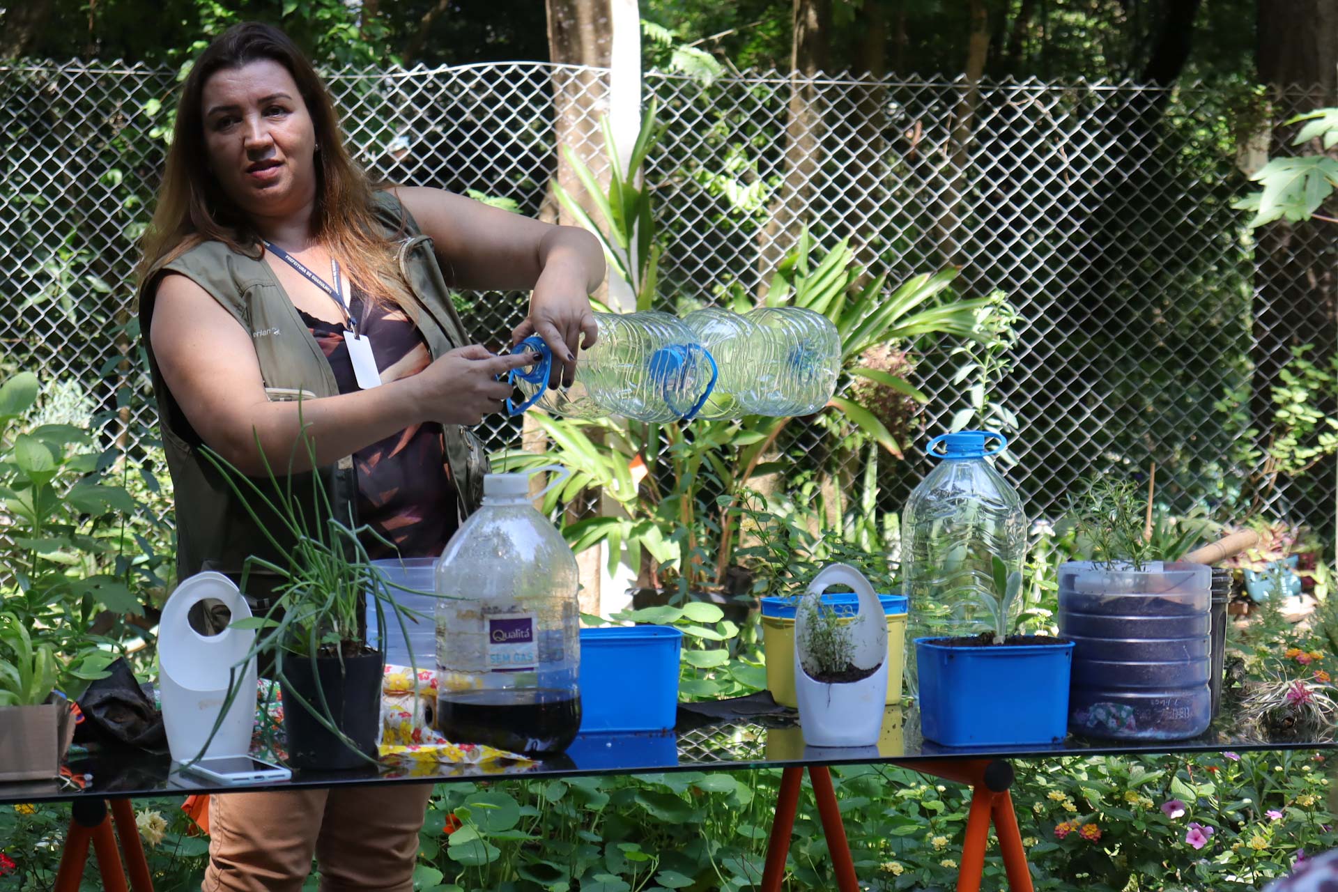 Embalagens de produtos de limpeza, higiene pessoal, alimentos e bebidas serviram como vasos para o plantio, modo criativo de a reutilizar as embalagens que geralmente iriam para o lixo comum.